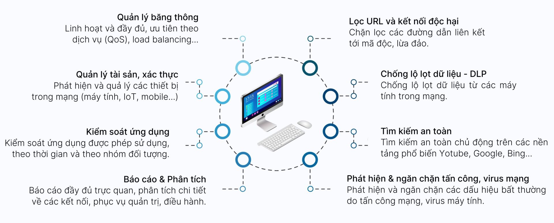Điểm nổi bật của giải pháp là khả năng quản lý người dùng và kiểm soát ứng dụng: nhà quản trị có thể xác định chính xác thiết bị đang sử dụng tài nguyên mạng, đồng thời chủ động cho phép, hạn chế hoặc chặn các ứng dụng không phục vụ công việc. Nhờ vậy, doanh nghiệp vừa nâng cao hiệu suất lao động, giảm thiểu lãng phí thời gian, vừa duy trì được sự ổn định, an toàn của hệ thống thông tin.