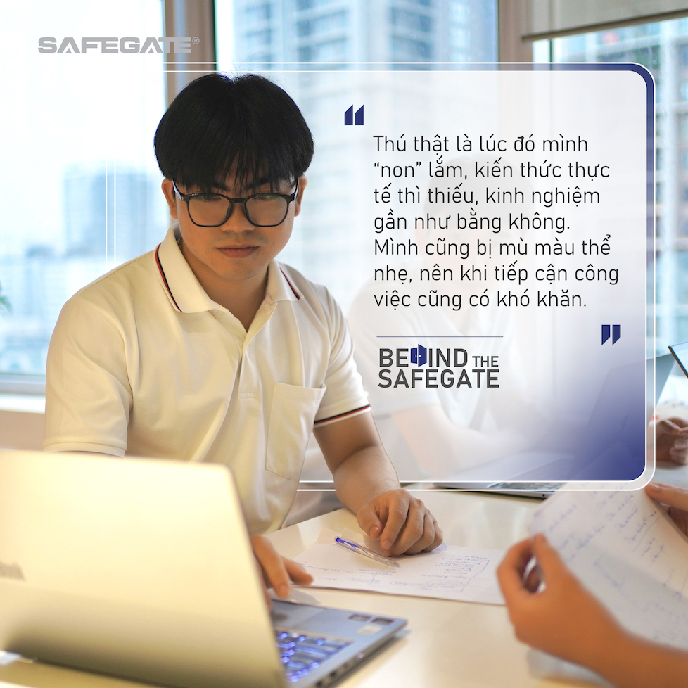 Những ngày đầu gia nhập team Frontend không hề dễ dàng với Khoa, cậu chia sẻ: “Thú thật là lúc đó mình “non” lắm, kiến thức thực tế thì thiếu, kinh nghiệm gần như bằng không. Mình cũng bị mù màu thể nhẹ, nên khi tiếp cận công việc cũng có khó khăn”. Nhưng đó cũng là lúc Khoa gặp được người dẫn dắt đầu tiên của mình: anh Nguyễn Thanh Tùng - Trường nhóm Frontend. Anh luôn kiên nhẫn hướng dẫn từng bước và dành cho cậu lời động viên tuy giản dị nhưng Khoa vẫn nhớ đến tận bây giờ: “Em phải tin vào bản thân mình thì cái gì mình cũng làm được”. Chính câu nói ấy trở thành “cú hích” tinh thần giúp Khoa thêm vững vàng, kiên trì và trưởng thành cùng SafeGate.