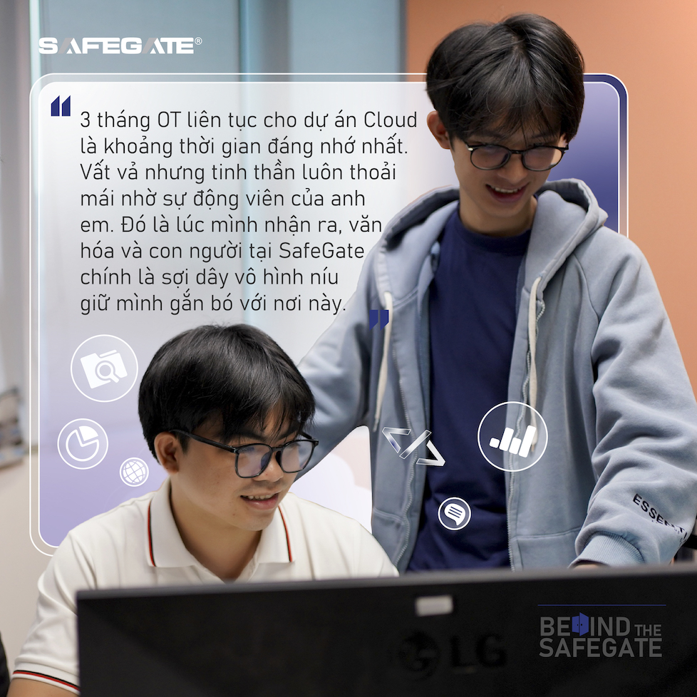 Bước ngoặt lớn nhất giúp Khoa chuyển mình từ một thực tập sinh sang nhân viên chính thức là khi được tham gia dự án xây dựng nền tảng quản lý Cloud của SafeGate. Đó cũng là lần đầu tiên cậu được tiếp cận một hệ thống quy mô lớn đến vậy. Kỷ niệm đáng nhớ nhất là chuỗi 3 tháng OT liên tục. Nghe thì có vẻ áp lực, nhưng Khoa chia sẻ đó lại là giai đoạn mà tinh thần của cả đội luôn thoải mái, phối hợp ăn ý và động viên nhau từng ngày. “Kết quả của đợt "cao điểm" đó không chỉ là sự thành công của dự án, mà còn là... số cân nặng của mình tăng lên đáng kể”.