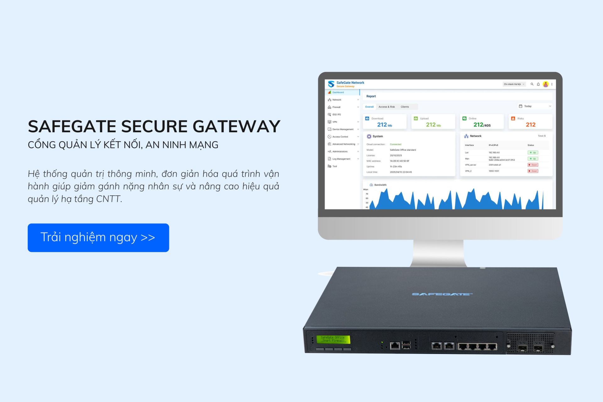 SafeGate Secure Gateway là giải pháp quản lý kết nối và an ninh mạng hợp nhất đầu tiên do Việt Nam phát triển, với mục tiêu giúp các doanh nghiệp đặc biệt là SME dễ dàng tiếp cận với giải pháp quản lý kết nối Internet thông minh với chi phí hợp lý, đồng thời giảm thiểu các rủi ro an ninh mạng.