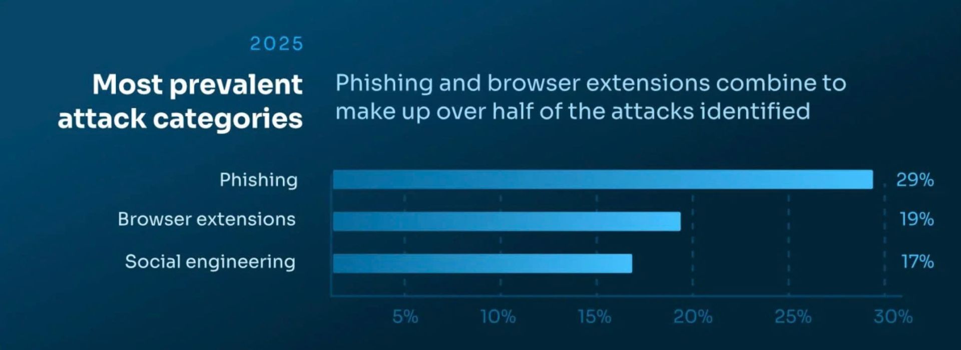 Báo cáo cũng cho thấy trình duyệt đang là nơi tập trung nhiều hình thức tấn công mới. Ba nhóm rủi ro nổi bật nhất trong năm 2025 gồm Phishing chiếm 29%, Browser Extensions chiếm 19% và Social engineering chiếm 17%.
